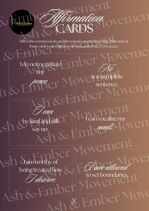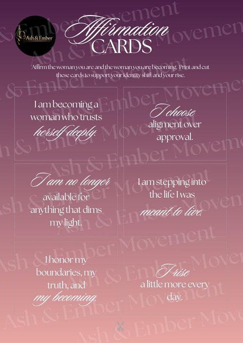 A printable set of empowering, discipline‑driven affirmations designed to help you stay consistent, build strength, and show up for yourself — even on the days you don’t feel like it. These cards are written in the signature Ash & Ember voice: grounded, gritty, feminine, and focused on identity over perfection.